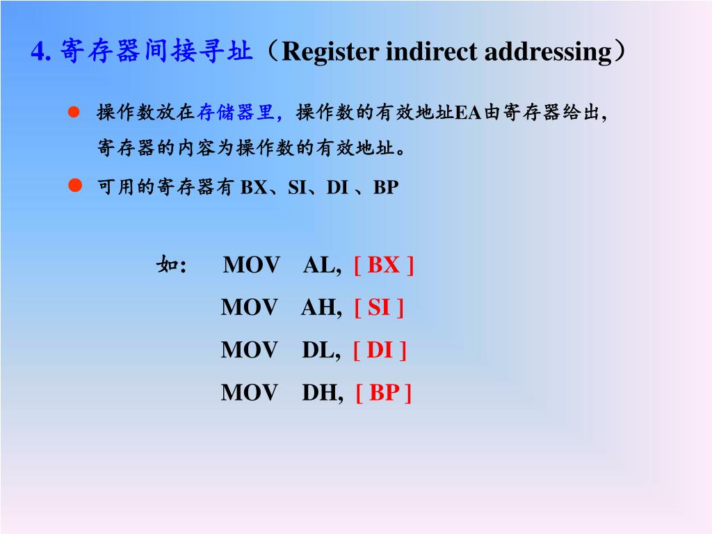 4. 寄存器间接寻址(Register indirect addressing) • 操作数放在存储器里,操作数的有效地址EA由寄存器给出, 寄存器的内容为操作数的有效地址。 • 可用的寄存器有 BX、SI、DI 、BP • 如: MOV AL, [ BX ] • MOV AH, [ SI ] • MOV DL, [ DI ] • MOV DH, [ BP ]