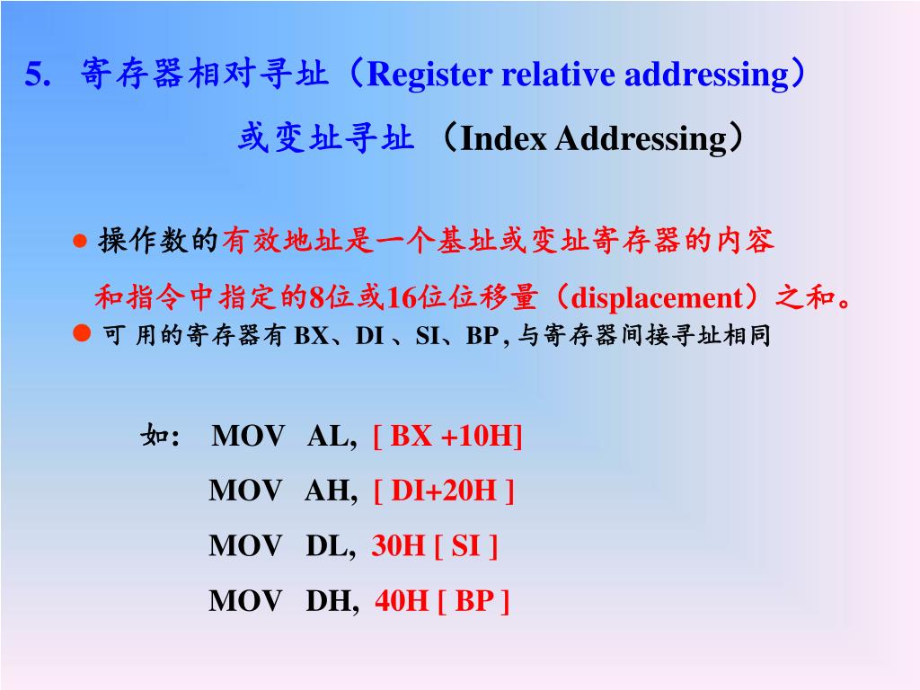 5. 寄存器相对寻址(Register relative addressing) • 或变址寻址 (Index Addressing) • 操作数的有效地址是一个基址或变址寄存器的内容 • 和指令中指定的8位或16位位移量(displacement)之和。 • 可 用的寄存器有 BX、DI 、SI、BP , 与寄存器间接寻址相同 • 如: MOV AL, [ BX +10H] • MOV AH, [ DI+20H ] • MOV DL, 30H [ SI ] • MOV DH, 40H [ BP ]