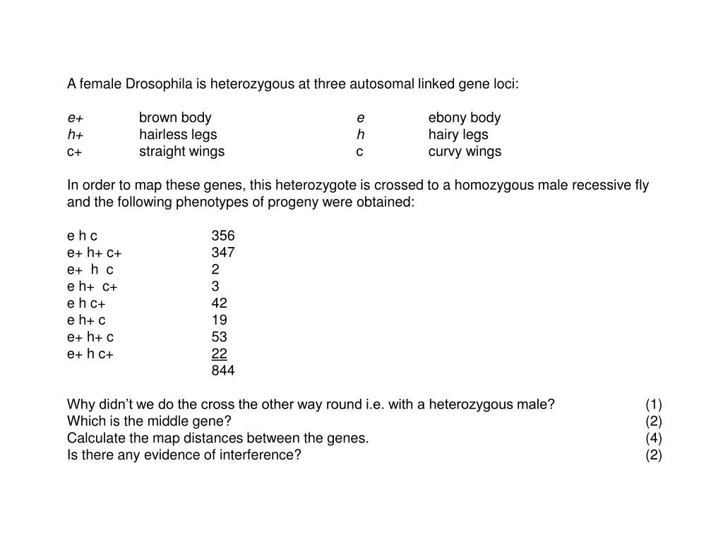 A female Drosophila is heterozygous at three autosomal linked gene loci: e+ brown body e ebony body h+ hairless legs h hairy legs c+ straight wings c curvy wings In order to map these genes, this heterozygote is crossed to a homozygous male recessive fly and the following phenotypes of progeny were obtained: e h c 356 e+ h+ c+ 347 e+ h c 2 e h+ c+ 3 e h c+ 42 e h+ c 19 e+ h+ c 53 e+ h c+ 22 844 Why didn’t we do the cross the other way round i.e. with a heterozygous male? (1) Which is the middle gene? (2) Calculate the map distances between the genes. (4) Is there any evidence of interference? (2)
