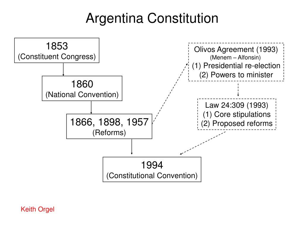Argentina Constitution 1853 (Constituent Congress) • Olivos Agreement (1993) • (Menem – Alfonsin) • Presidential re-election • Powers to minister 1860 (National Convention) • Law 24:309 (1993) • Core stipulations • Proposed reforms 1866, 1898, 1957 (Reforms) 1994 (Constitutional Convention) Keith Orgel