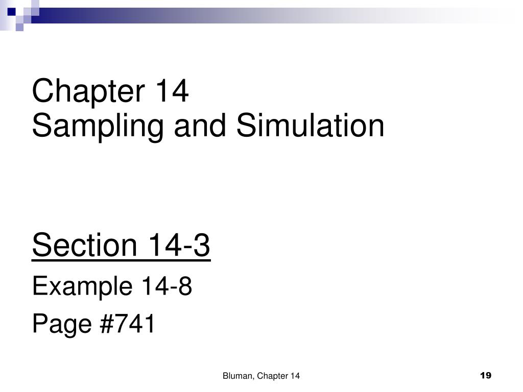 Chapter 14Sampling and Simulation Section 14-3 Example 14-8 Page #741 Bluman, Chapter 14