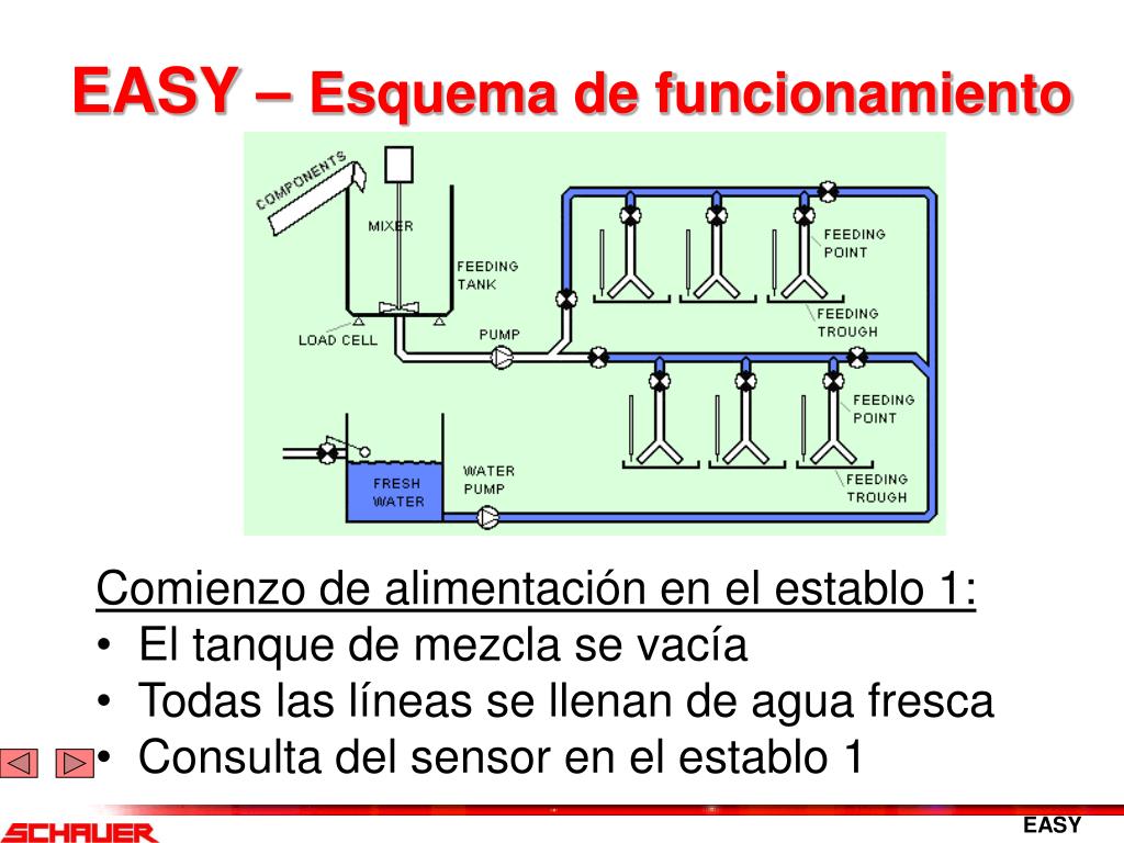 EASY – Esquema de funcionamiento • Alimentación: • El alimento es bombeado hasta la última válvula • El exceso de agua pura es presionada hasta el tanque de agua • Empieza la alimentación en la válvula 1 del establo1 EASY