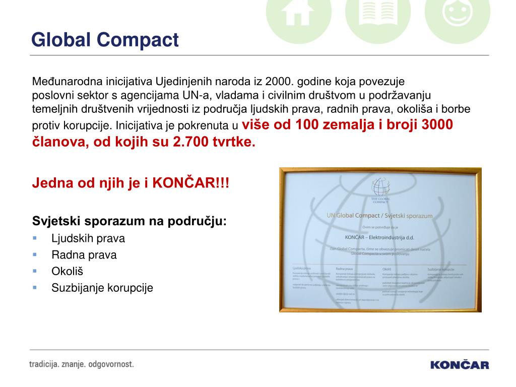 Global Compact Međunarodna inicijativa Ujedinjenih naroda iz 2000. godine koja povezuje poslovni sektor s agencijama UN-a, vladama i civilnim društvom u podržavanju temeljnih društvenih vrijednosti iz područja ljudskih prava, radnih prava, okoliša i borbe protiv korupcije. Inicijativa je pokrenuta u više od 100 zemalja i broji 3000 članova, od kojih su 2.700 tvrtke. Jedna od njih je i KONČAR!!! Svjetski sporazum na području: • Ljudskih prava • Radna prava • Okoliš • Suzbijanje korupcije