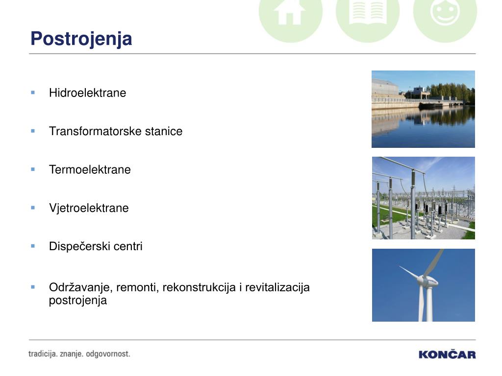 Postrojenja • Hidroelektrane • Transformatorske stanice • Termoelektrane • Vjetroelektrane • Dispečerski centri • Održavanje, remonti, rekonstrukcija i revitalizacija postrojenja