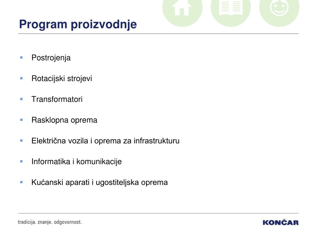 Program proizvodnje • Postrojenja • Rotacijski strojevi • Transformatori • Rasklopna oprema • Električna vozila i oprema za infrastrukturu • Informatika i komunikacije • Kućanski aparati i ugostiteljska oprema