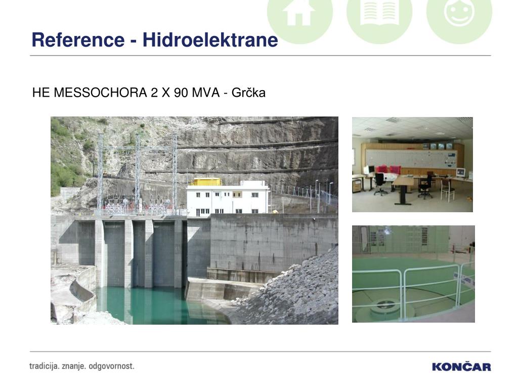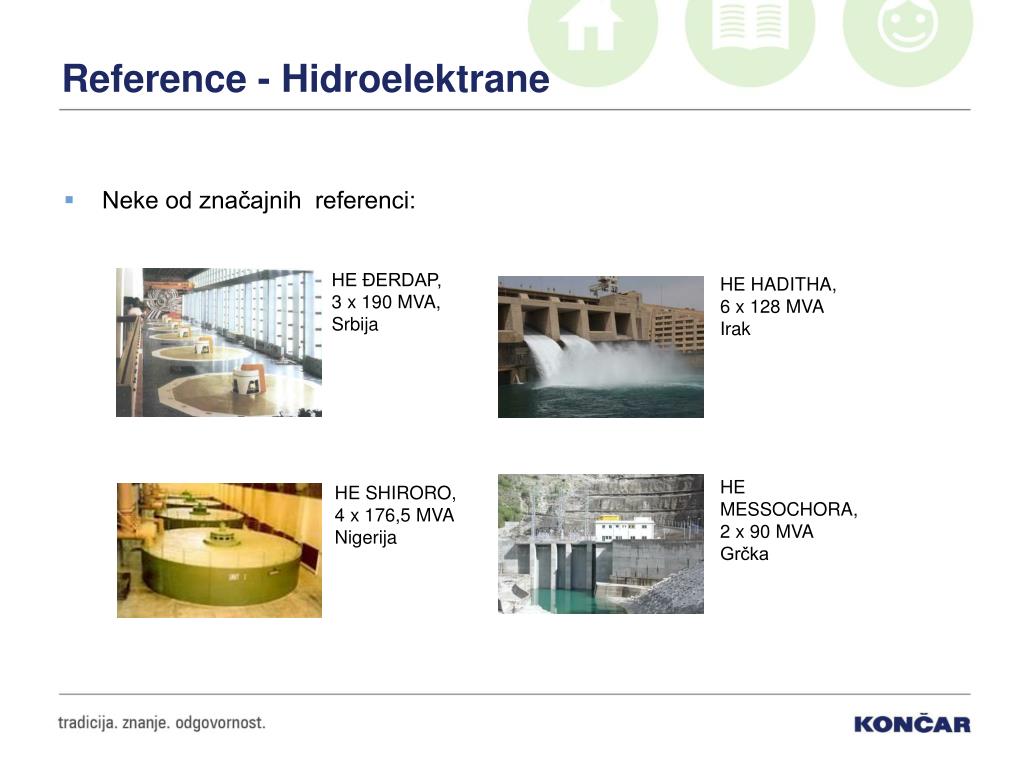 Reference - Hidroelektrane • Neke od značajnih referenci: HE ĐERDAP, 3 x 190 MVA, Srbija HE HADITHA, 6 x 128 MVA Irak HE MESSOCHORA, 2 x 90 MVA Grčka HE SHIRORO, 4 x 176,5 MVA Nigerija