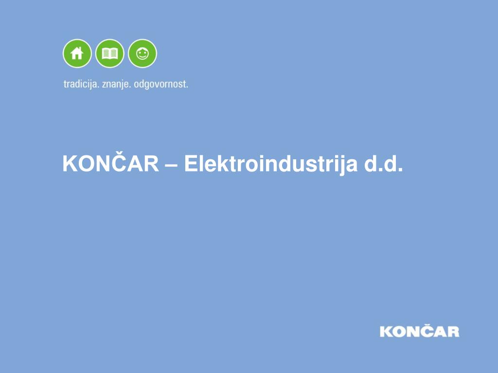 Osnovni podaci • 1921. Osnovan kao ELEKTRA d.d., Zagreb • 1921. Postaje Siemens d.d. • 1946. Dobiva ime RADE KONČAR • od 1991. KONČAR - ELEKTROINDUSTRIJA d.d. Danas: • Koncern • 20 društava kćeri i 1 pridruženo društvo • Društva i predstavništva u inozemstvu: Švicarska, Bosna i Hercegovina, Ruska Federacija i Srbija • 4110 zaposlenih • Prihod od prodaje: 364 mil EUR • Izvoz: 46%