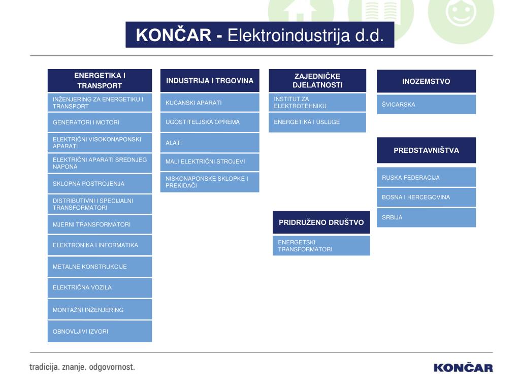 KONČAR - Elektroindustrija d.d. ENERGETIKA I TRANSPORT INDUSTRIJA I TRGOVINA ZAJEDNIČKE DJELATNOSTI INOZEMSTVO INŽENJERING ZA ENERGETIKU I TRANSPORT KUĆANSKI APARATI INSTITUT ZA ELEKTROTEHNIKU ŠVICARSKA ENERGETIKA I USLUGE UGOSTITELJSKA OPREMA GENERATORI I MOTORI ELEKTRIČNI VISOKONAPONSKI APARATI ALATI PREDSTAVNIŠTVA MALI ELEKTRIČNI STROJEVI ELEKTRIČNI APARATI SREDNJEG NAPONA RUSKA FEDERACIJA NISKONAPONSKE SKLOPKE I PREKIDAČI SKLOPNA POSTROJENJA BOSNA I HERCEGOVINA DISTRIBUTIVNI I SPECIJALNI TRANSFORMATORI SRBIJA PRIDRUŽENO DRUŠTVO MJERNI TRANSFORMATORI ELEKTRONIKA I INFORMATIKA ENERGETSKI TRANSFORMATORI METALNE KONSTRUKCIJE ELEKTRIČNA VOZILA MONTAŽNI INŽENJERING OBNOVLJIVI IZVORI