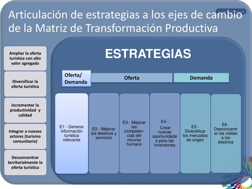 CAMBIO DE MATRIZ • Modelo de desarrolloconsciente (turismosostenible + turismoético + experienciatransformadora de vida) de los recursosturísticos, utilizando de manerainteligente los espaciosdisponibles (destinos, servicios, personas), generando alto valor agregado, adelantándose a la tendencia, y considerando la inclusióneconómica y social, a través del conocimiento y del talentohumano. Cambio de Políticas