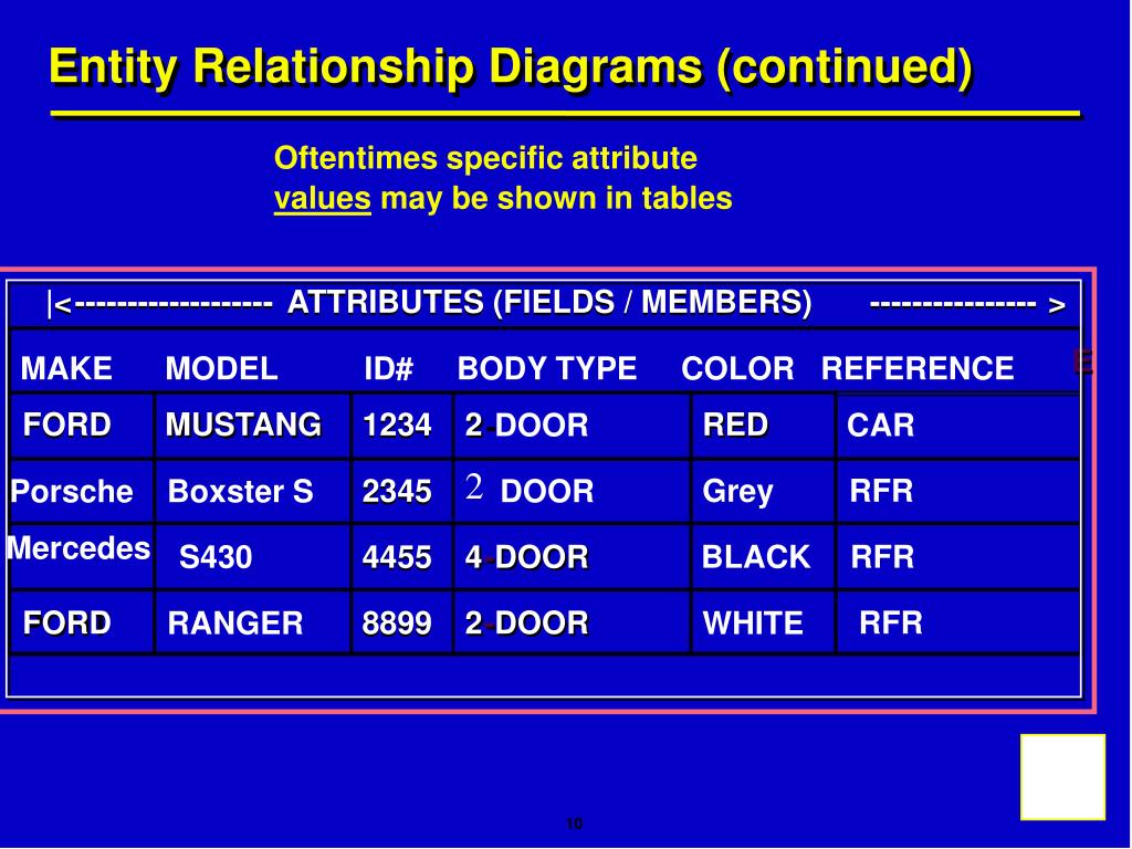 Entity Relationship Diagrams (continued) Entity Relationship Diagrams (continued) Oftentimes specific attribute values may be shown in tables |< ------------------- ATTRIBUTES (FIELDS / MEMBERS) ---------------- > |< ------------------- ATTRIBUTES (FIELDS / MEMBERS) ---------------- > E E MAKE MODEL ID# BODY TYPE COLOR REFERENCE FORD MUSTANG 1234 2 RED DOOR CAR FORD MUSTANG 1234 2 - RED 2 2345 Grey RFR Porsche Boxster S DOOR 2345 Mercedes S430 4455 4 - DOOR BLACK RFR 4455 4 - DOOR FORD 8899 2 - DOOR RFR RANGER WHITE PONT 8899 2 - DOOR 10