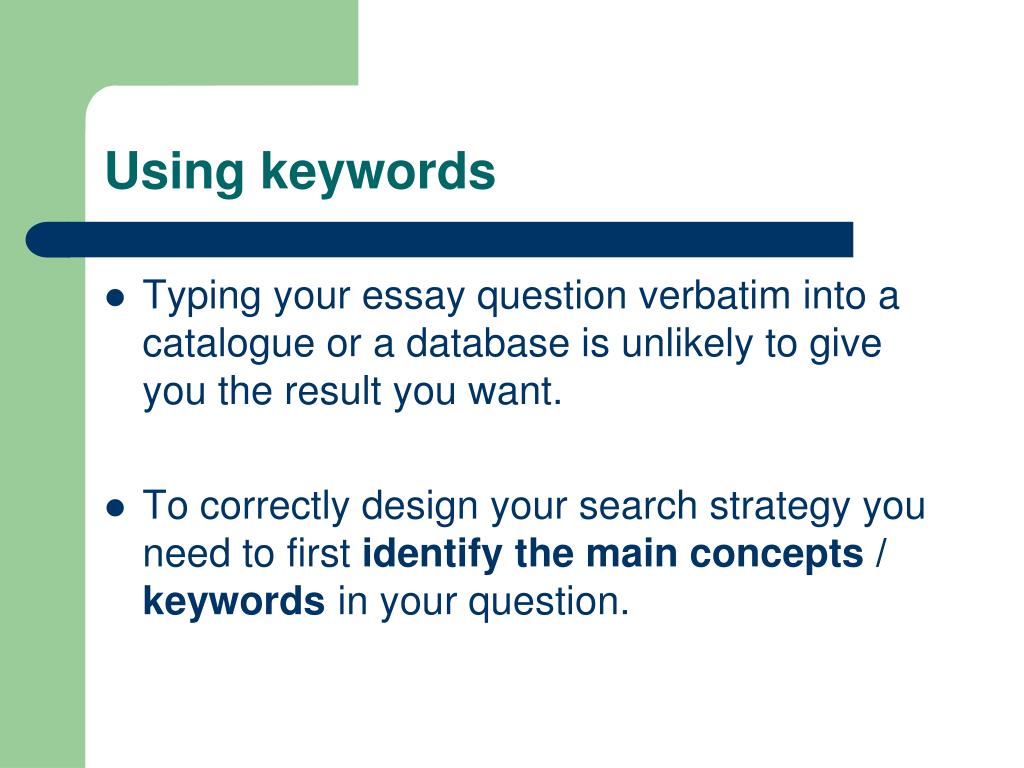 Using keywords Typing your essay question verbatim into a catalogue or a database is unlikely to give you the result you want. To correctly design your search strategy you need to first identify the main concepts / keywords in your question.