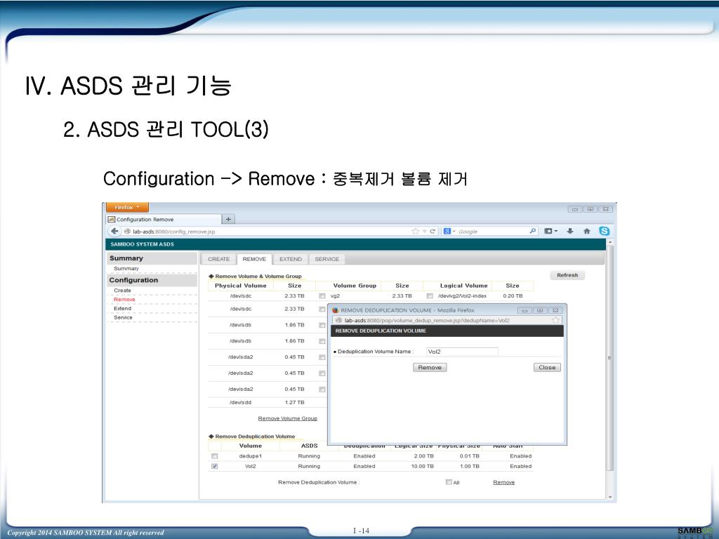 IV. ASDS 관리 기능 2. ASDS 관리 TOOL(3) Configuration -> Remove : 중복제거 볼륨 제거