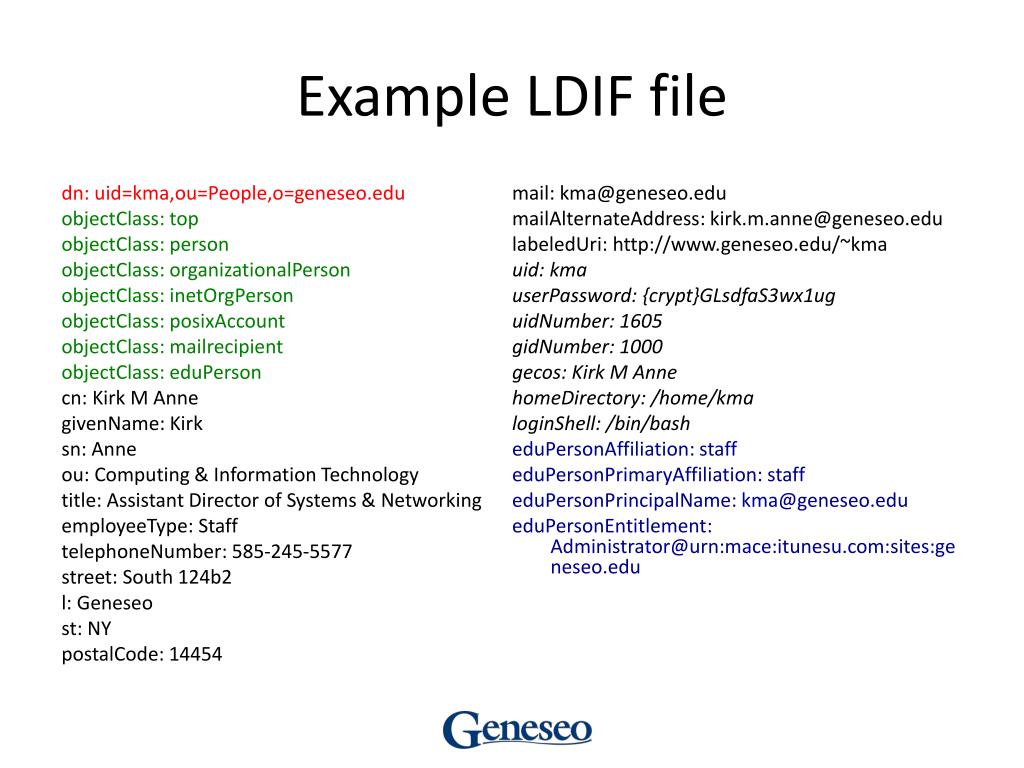 Example LDIF file dn: uid=kma,ou=People,o=geneseo.edu objectClass: top objectClass: person objectClass: organizationalPerson objectClass: inetOrgPerson objectClass: posixAccount objectClass: mailrecipient objectClass: eduPerson cn: Kirk M Anne givenName: Kirk sn: Anne ou: Computing & Information Technology title: Assistant Director of Systems & Networking employeeType: Staff telephoneNumber: 585-245-5577 street: South 124b2 l: Geneseo st: NY postalCode: 14454 mail: kma@geneseo.edu mailAlternateAddress: kirk.m.anne@geneseo.edu labeledUri: http://www.geneseo.edu/~kma uid: kma userPassword: {crypt}GLsdfaS3wx1ug uidNumber: 1605 gidNumber: 1000 gecos: Kirk M Anne homeDirectory: /home/kma loginShell: /bin/bash eduPersonAffiliation: staff eduPersonPrimaryAffiliation: staff eduPersonPrincipalName: kma@geneseo.edu eduPersonEntitlement: Administrator@urn:mace:itunesu.com:sites:geneseo.edu