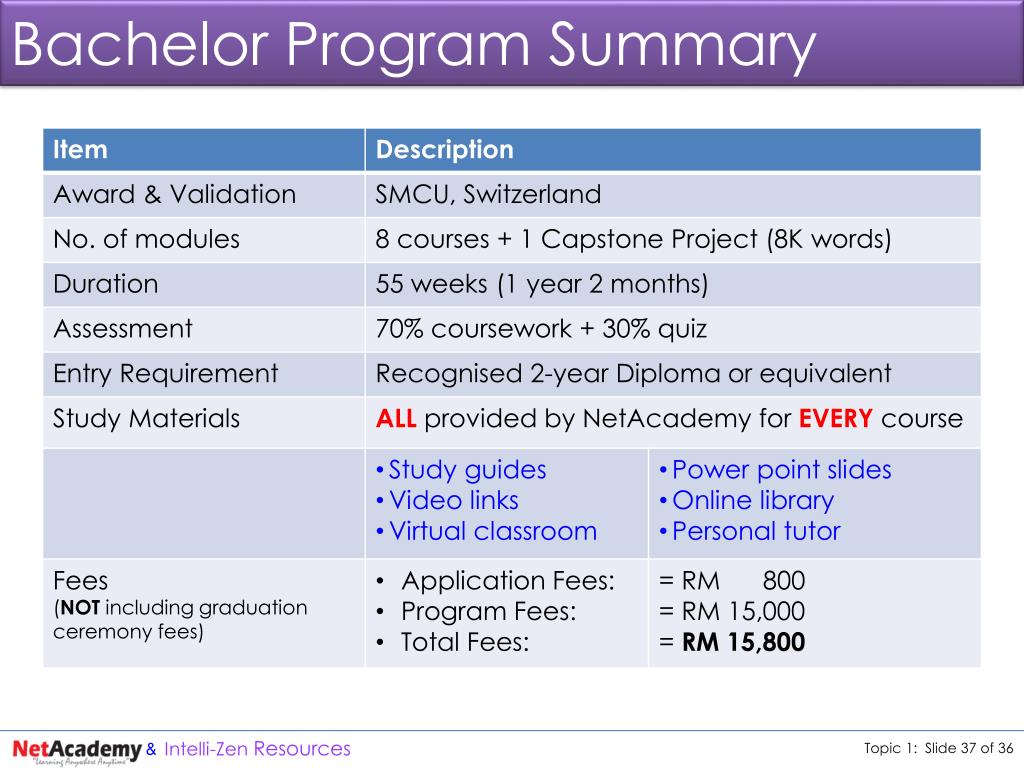 Bachelor Program Progression 8 courses x 6 weeks/course: • 48 weeks + 7 weeks for submission of last course assignment = 55 weeks • Project Paper & Case Study starting concurrently with 5th course lasting = 31 weeks • Total recommended duration = 55 weeks