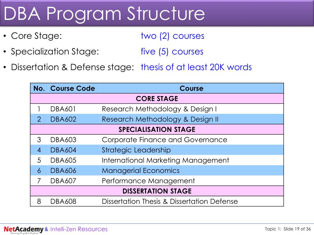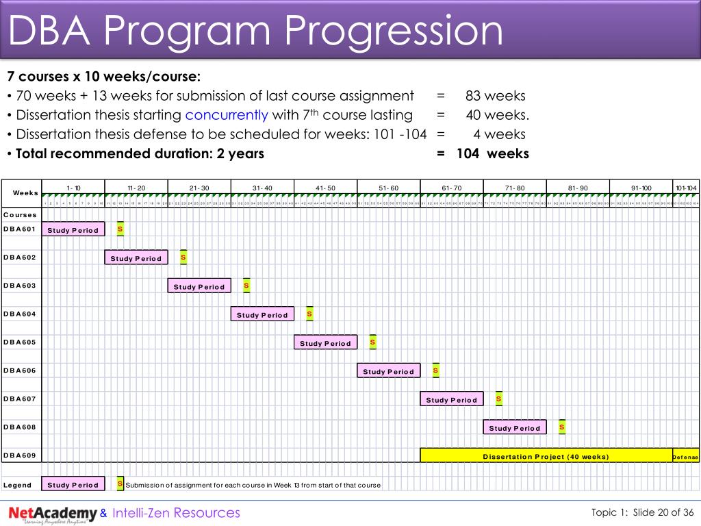 DBA Program Progression 7 courses x 10 weeks/course: • 70 weeks + 13 weeks for submission of last course assignment = 83 weeks • Dissertation thesis starting concurrently with 7th course lasting = 40 weeks. • Dissertation thesis defense to be scheduled for weeks: 101 -104 = 4 weeks • Total recommended duration: 2 years = 104 weeks