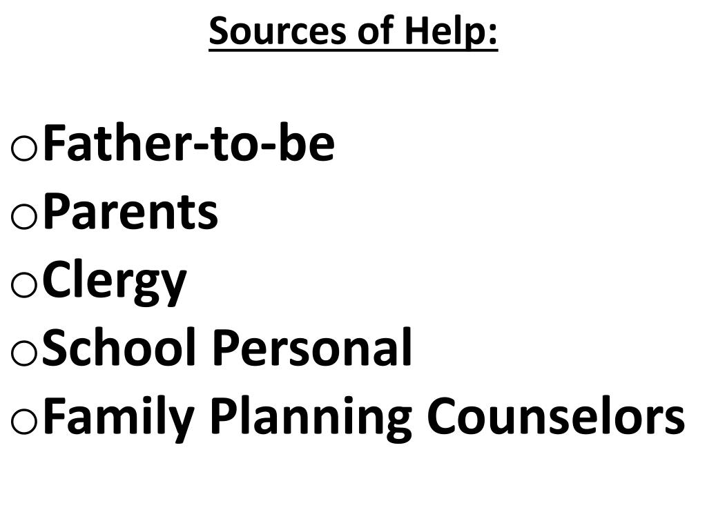 Sources of Help: • Father-to-be • Parents • Clergy • School Personal • Family Planning Counselors