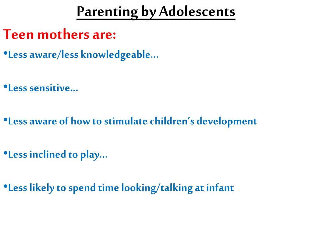 Parenting by Adolescents • Teen mothers are: • Less aware/less knowledgeable… • Less sensitive… • Less aware of how to stimulate children’s development • Less inclined to play… • Less likely to spend time looking/talking at infant