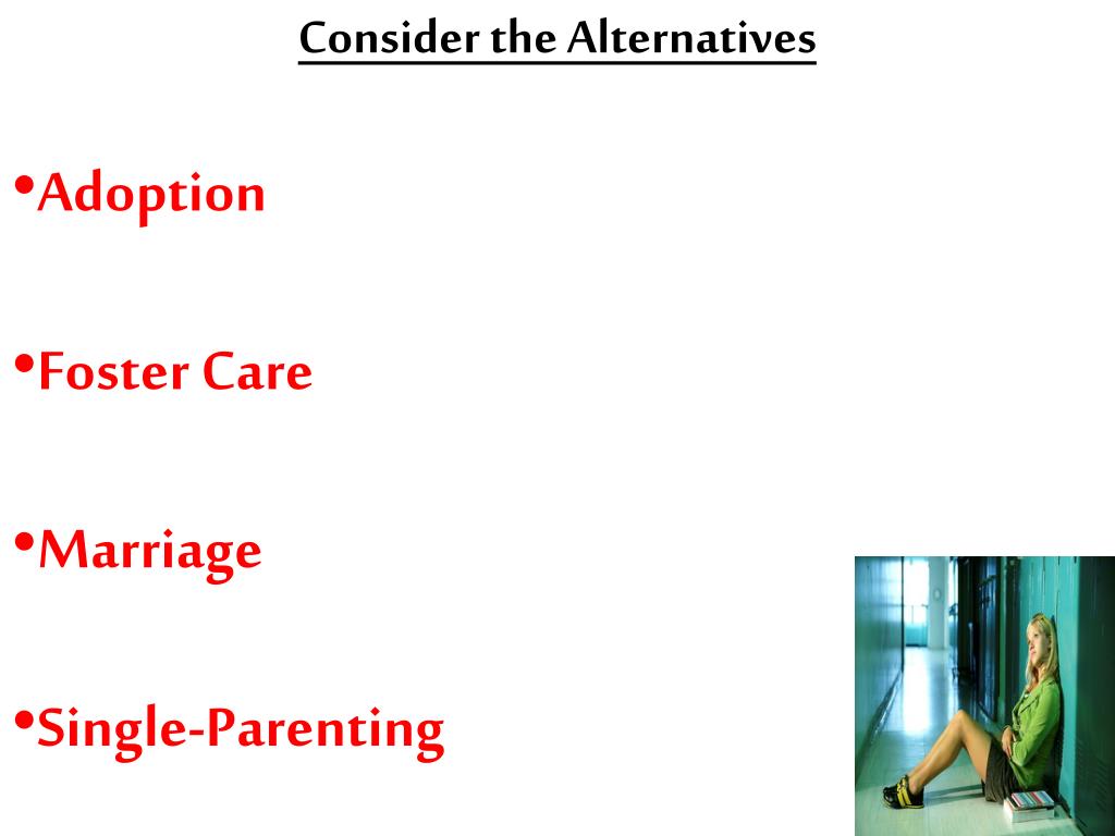 Consider the Alternatives • Adoption • Foster Care • Marriage • Single-Parenting