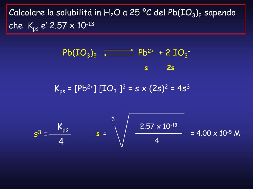 Calcolare la solubilitá in H2O a 25 ºC del Pb(IO3)2 sapendo che Kps e’ 2.57 x 10-13 Pb(IO3)2 Pb2+ + 2 IO3- s 2s Kps = [Pb2+] [IO3-]2 = s x (2s)2 = 4s3 3 Kps 2.57 x 10-13 s3= = 4.00 x 10-5 M s= 4 4