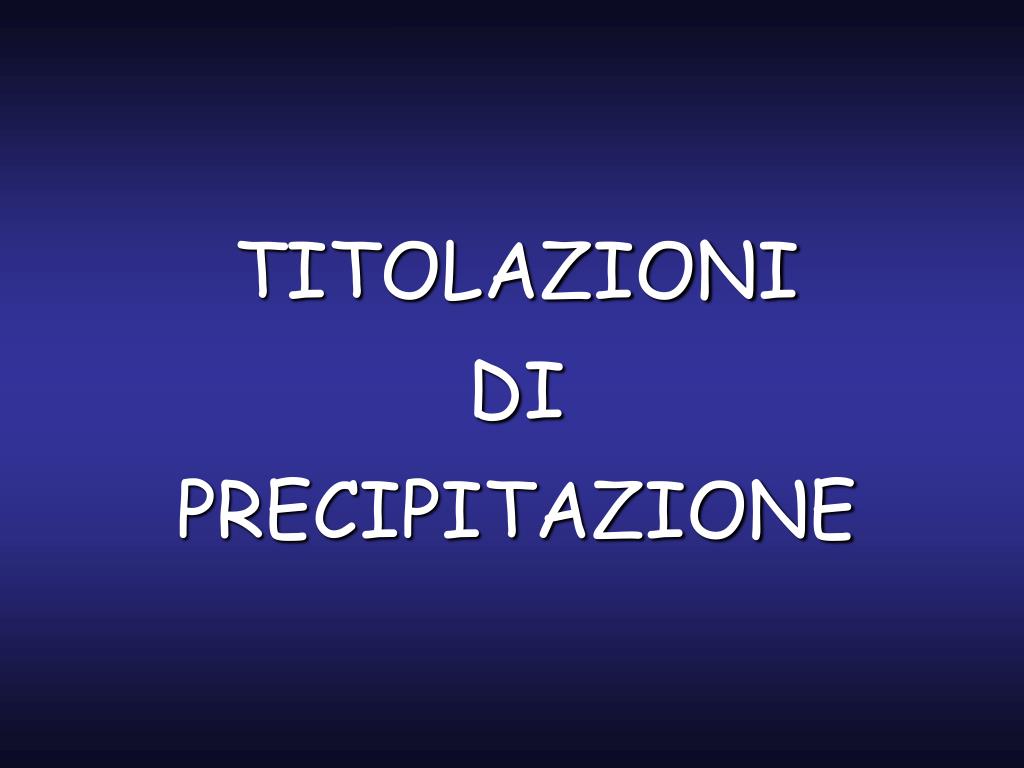 CURVE DI TITOLAZIONE DI MISCELE TITOLAZIONI DI PRECIPITAZIONE • Miscele che portano alla formazione di due precipitati con differente solubilità danno curve di titolazione con due differenti punti di equivalenza • Si forma per primo il precipitato meno solubile