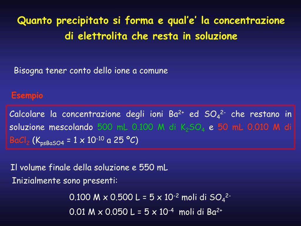Quanto precipitato si forma e qual’e’ la concentrazione di elettrolita che resta in soluzione Bisogna tener conto dello ione a comune Esempio Calcolare la concentrazione degli ioni Ba2+ ed SO42- che restano in soluzione mescolando500 mL 0.100 M di K2SO4e50 mL 0.010 M di BaCl2(KpsBaSO4 = 1 x 10-10 a 25 ºC) Il volume finale della soluzione e 550 mL Inizialmente sono presenti: 0.100 M x 0.500 L = 5 x 10-2 moli di SO42- 0.01 M x 0.050 L = 5 x 10-4 moli di Ba2+