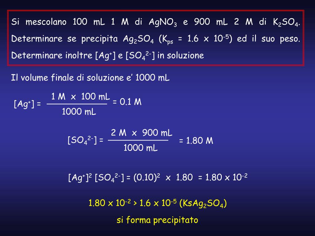 Si mescolano 100 mL 1 M di AgNO3 e 900 mL 2 M di K2SO4. Determinare se precipita Ag2SO4 (Kps = 1.6 x 10-5) ed il suo peso. Determinare inoltre [Ag+] e [SO42-] in soluzione Il volume finale di soluzione e’ 1000 mL 1 M x 100 mL = 0.1 M [Ag+] = 1000 mL 2 M x 900 mL [SO42-] = = 1.80 M 1000 mL [Ag+]2 [SO42-] = (0.10)2 x 1.80 = 1.80 x 10-2 1.80 x 10-2 > 1.6 x 10-5 (KsAg2SO4) si forma precipitato