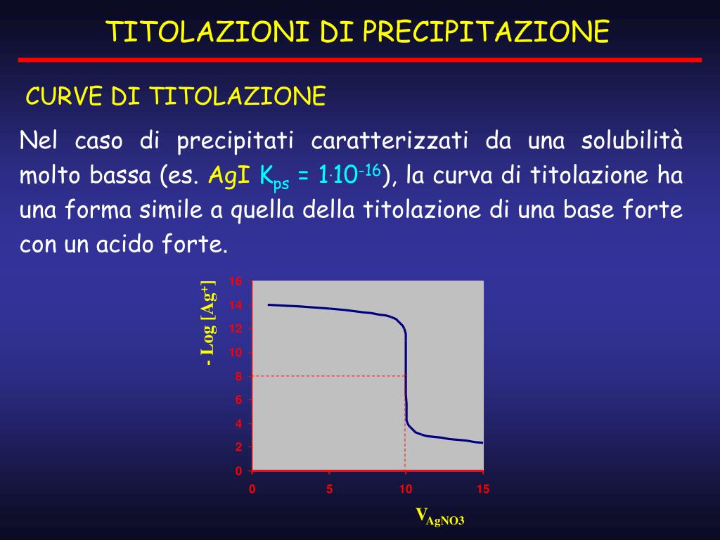 - Log [Ag+] VAgNO3 TITOLAZIONI DI PRECIPITAZIONE CURVE DI TITOLAZIONE Nel caso di precipitati caratterizzati da una solubilità molto bassa (es. AgI Kps = 1.10-16), la curva di titolazione ha una forma simile a quella della titolazione di una base forte con un acido forte.
