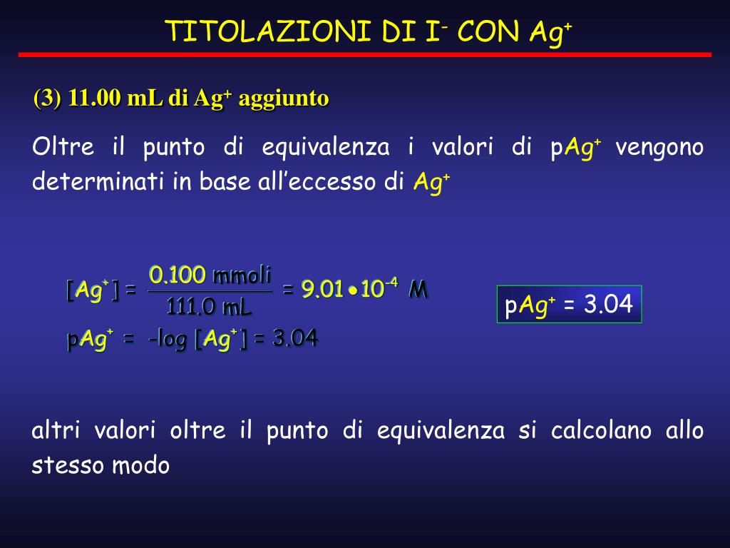 TITOLAZIONI DI I- CON Ag+ (3) 11.00 mL di Ag+ aggiunto Oltre il punto di equivalenza i valori di pAg+ vengono determinati in base all’eccesso di Ag+ altri valori oltre il punto di equivalenza si calcolano allo stesso modo pAg+= 3.04