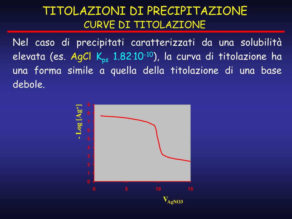 - Log [Ag+] VAgNO3 TITOLAZIONI DI PRECIPITAZIONE CURVE DI TITOLAZIONE Nel caso di precipitati caratterizzati da una solubilità elevata (es. AgCl Kps 1.82.10-10), la curva di titolazione ha una forma simile a quella della titolazione di una base debole.