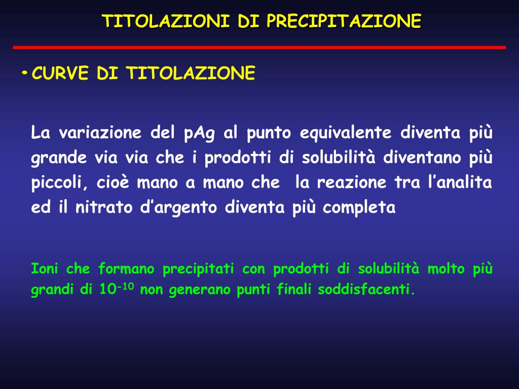 CURVE DI TITOLAZIONE TITOLAZIONI DI PRECIPITAZIONE La variazione del pAg al punto equivalente diventa più grande via via che i prodotti di solubilità diventano più piccoli, cioè mano a mano che la reazione tra l’analita ed il nitrato d’argento diventa più completa Ioni che formano precipitati con prodotti di solubilità molto più grandi di 10-10 non generano punti finali soddisfacenti.