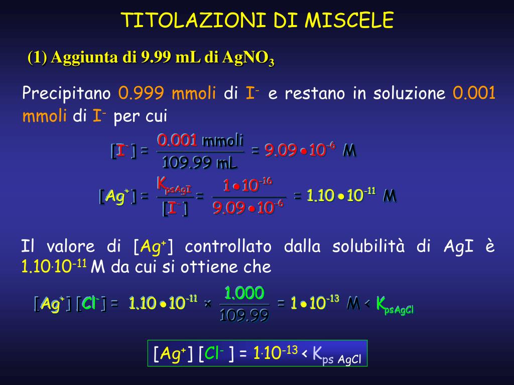 TITOLAZIONI DI MISCELE (1) Aggiunta di 9.99 mL di AgNO3 Precipitano 0.999 mmoli di I-e restano in soluzione 0.001 mmoli di I-per cui Il valore di [Ag+]controllato dalla solubilità di AgI è 1.10.10-11M da cui si ottiene che [Ag+][Cl-] = 1.10-13<Kps AgCl