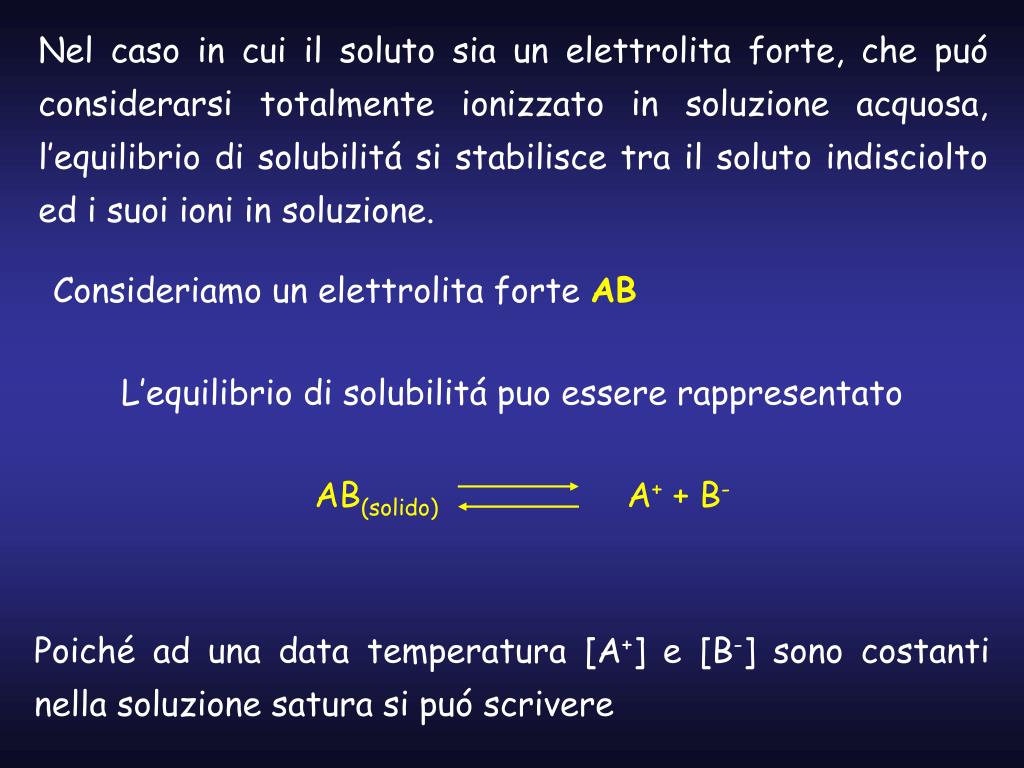 Nel caso in cui il soluto sia un elettrolita forte, che puó considerarsi totalmente ionizzato in soluzione acquosa, l’equilibrio di solubilitá si stabilisce tra il soluto indisciolto ed i suoi ioni in soluzione. Consideriamo un elettrolita forte AB L’equilibrio di solubilitá puo essere rappresentato AB(solido) A+ + B- Poiché ad una data temperatura [A+] e [B-] sono costanti nella soluzione satura si puó scrivere