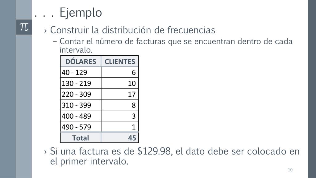 . . . Ejemplo • Construir la distribución de frecuencias • Contar el número de facturas que se encuentran dentro de cada intervalo. • Si una factura es de $129.98, el dato debe ser colocado en el primer intervalo.