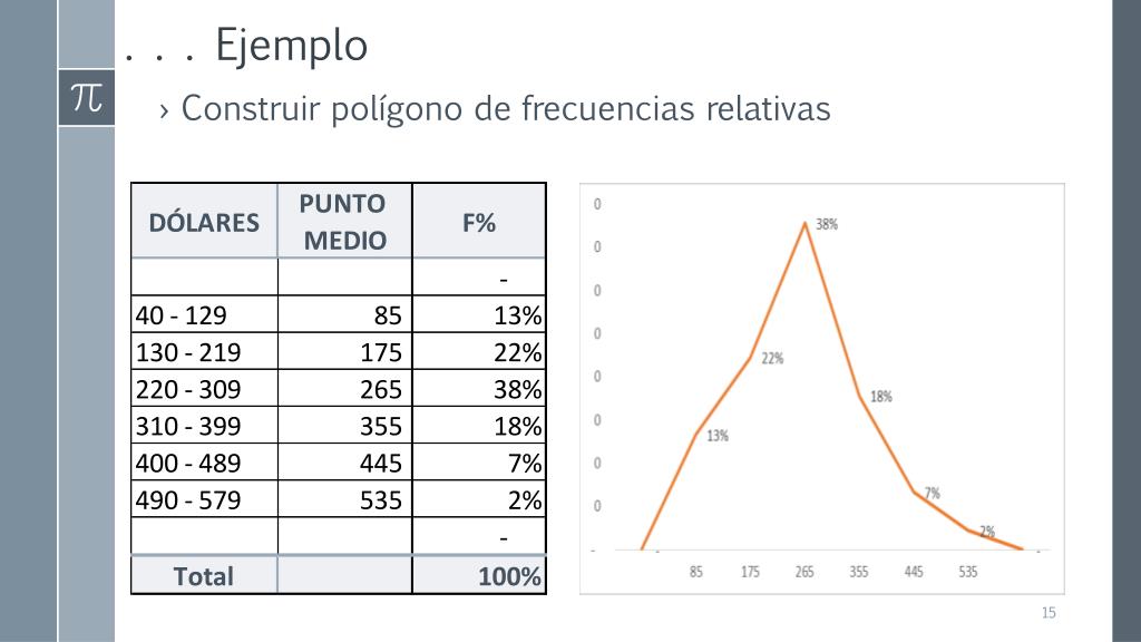 Polígono de frecuencias • Es la gráfica de línea formada por los puntos medios de las clases o intervalos y las frecuencias. • Las frecuencias pueden ser absolutas o relativas (%).