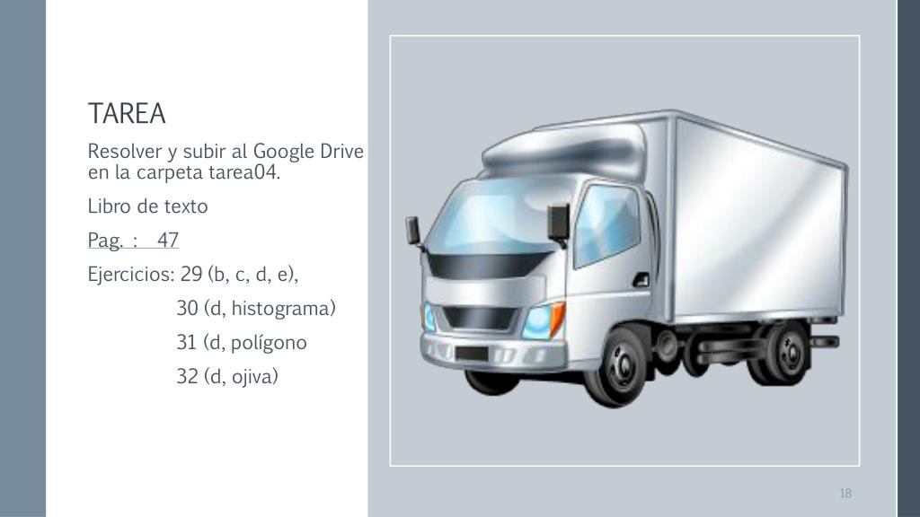 TAREA Resolver y subir al Google Drive en la carpeta tarea04. Libro de texto Pag. : 47 Ejercicios: 29 (b, c, d, e), 30 (d, histograma) 31 (d, polígono 32 (d, ojiva)
