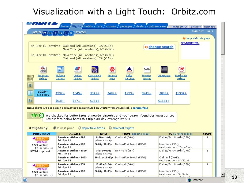 Key Questions to Ask about a Viz • What does it teach/show/elucidate? • What is the key contribution? • What are some compelling, useful examples? • Could it have been done more simply? • Have there been usability studies done? What do they show?