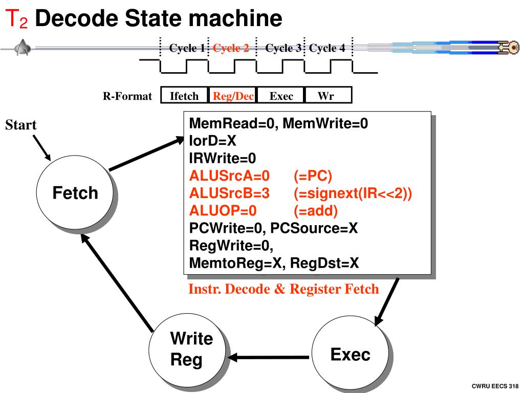 T2 Decode State machine Cycle 1 Cycle 2 Cycle 3 Cycle 4 Ifetch Reg/Dec Exec Wr R-Format Write Reg Exec Fetch MemRead=0, MemWrite=0IorD=XIRWrite=0ALUSrcA=0 (=PC)ALUSrcB=3 (=signext(IR<<2))ALUOP=0 (=add)PCWrite=0, PCSource=XRegWrite=0, MemtoReg=X, RegDst=X Start Instr. Decode & Register Fetch CWRU EECS 318