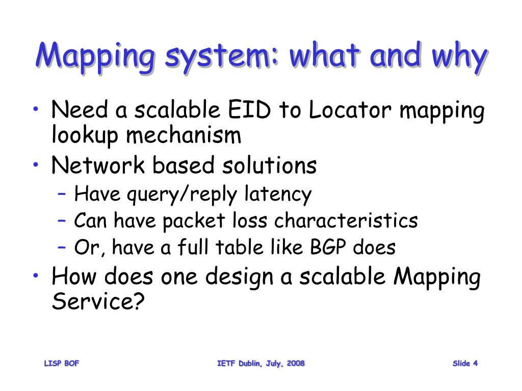 Mapping system: what and why • Need a scalable EID to Locator mapping lookup mechanism • Network based solutions • Have query/reply latency • Can have packet loss characteristics • Or, have a full table like BGP does • How does one design a scalable Mapping Service? IETF Dublin, July, 2008