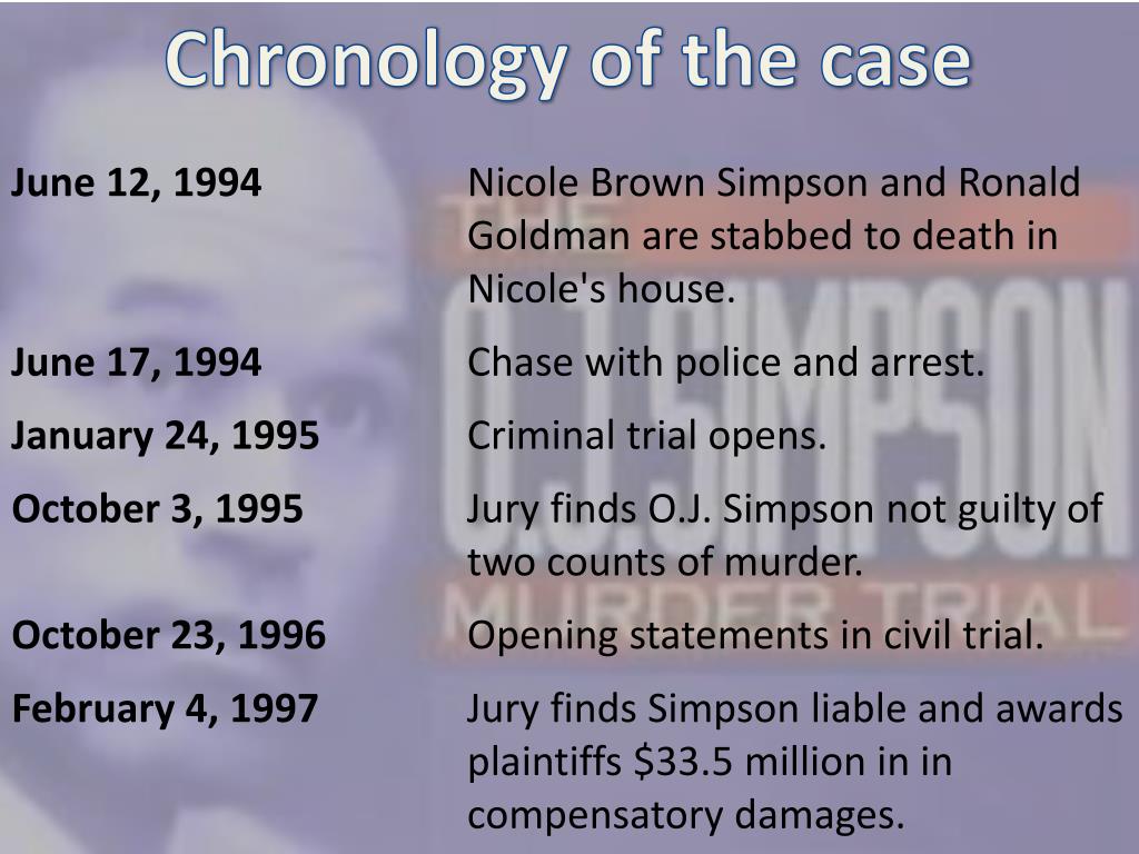 Chronology of the case June 12, 1994 Nicole Brown Simpson and Ronald Goldman are stabbed to death in Nicole's house. June 17, 1994 Chase with police and arrest. January 24, 1995 Criminal trial opens. October 3, 1995 Jury finds O.J. Simpson not guilty of two counts of murder. October 23, 1996 Opening statements in civil trial. February 4, 1997 Jury finds Simpson liable and awards plaintiffs $33.5 million in in compensatory damages.
