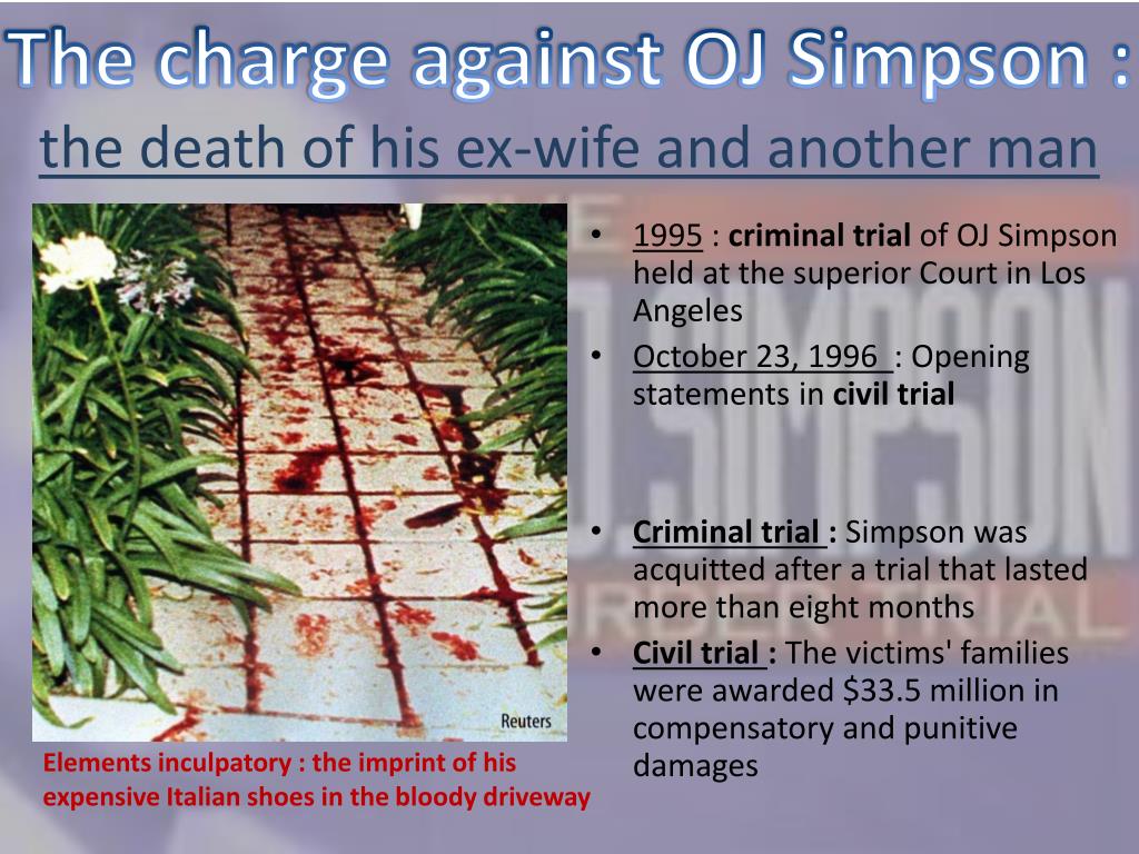 The charge against OJ Simpson : the death of his ex-wife and another man 1995 : criminal trial of OJ Simpson held at the superior Court in Los Angeles October 23, 1996 : Opening statements in civil trial Criminal trial : Simpson was acquitted after a trial that lasted more than eight months Civil trial : The victims' families were awarded $33.5 million in compensatory and punitive damages Elementsinculpatory : the imprint of his expensive Italian shoes in the bloody driveway