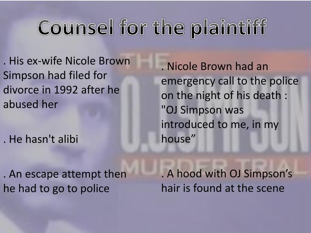 Counsel for the plaintiff . His ex-wife Nicole Brown Simpson had filed for divorce in 1992 after he abused her . He hasn't alibi . An escape attempt then he had to go to police . Nicole Brown had an emergency call to the police on the night of his death : "OJ Simpson was introduced to me, in my house” . A hood with OJ Simpson’s hair is found at the scene