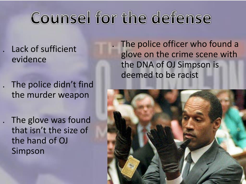 Counsel for the defense . The police officer who found a glove on the crime scene with the DNA of OJ Simpson is deemed to be racist . Lack of sufficientevidence . The police didn’t find the murder weapon . The glove was found that isn’t the size of the hand of OJ Simpson