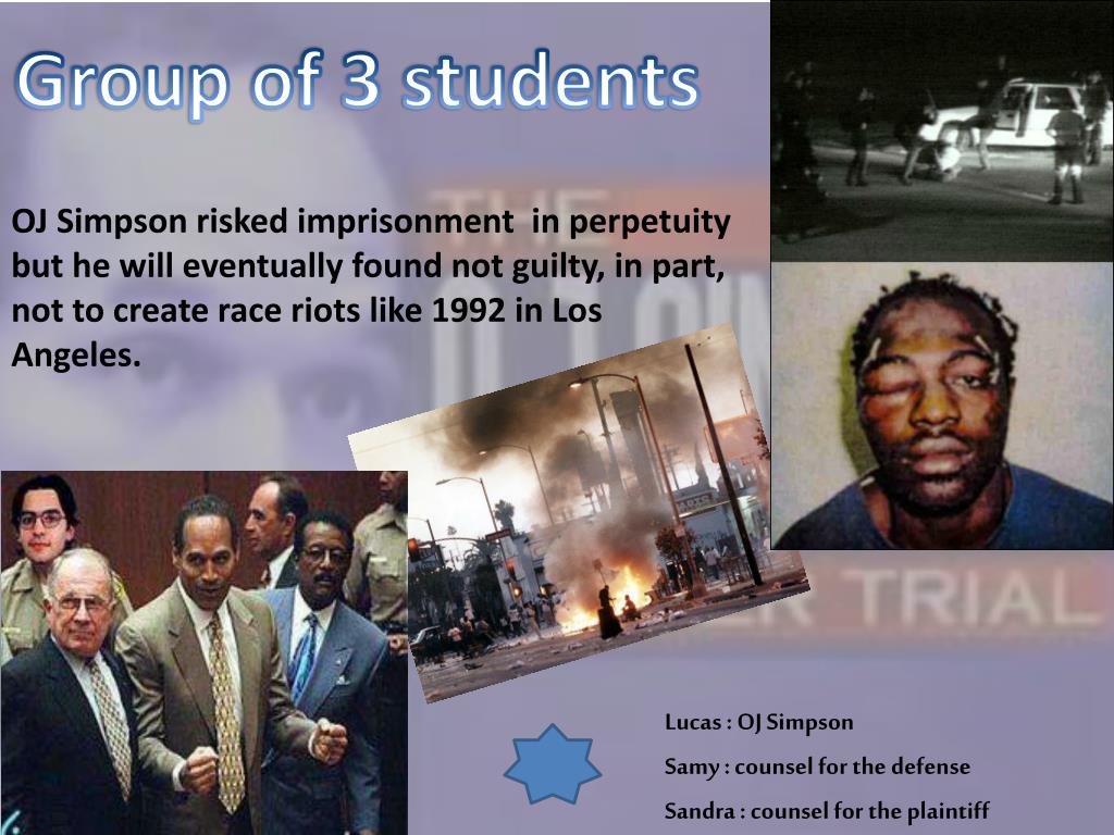 Group of 3 students OJ Simpson risked imprisonment in perpetuity but he will eventually found not guilty, in part, not to create race riots like 1992 in Los Angeles. Lucas : OJ Simpson Samy : counsel for the defense Sandra : counsel for the plaintiff