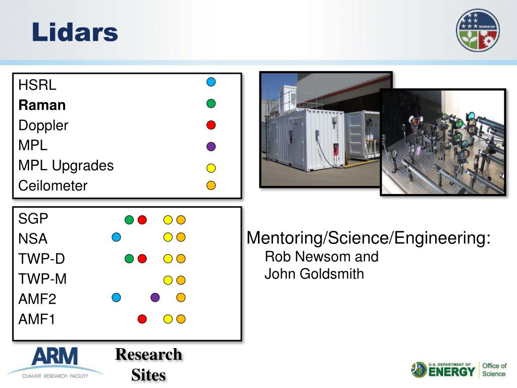 Lidars HSRL Raman Doppler MPL MPL Upgrades Ceilometer SGP NSA TWP-D TWP-M AMF2 AMF1 Mentoring/Science/Engineering:Rob Newsom and John Goldsmith Research Sites