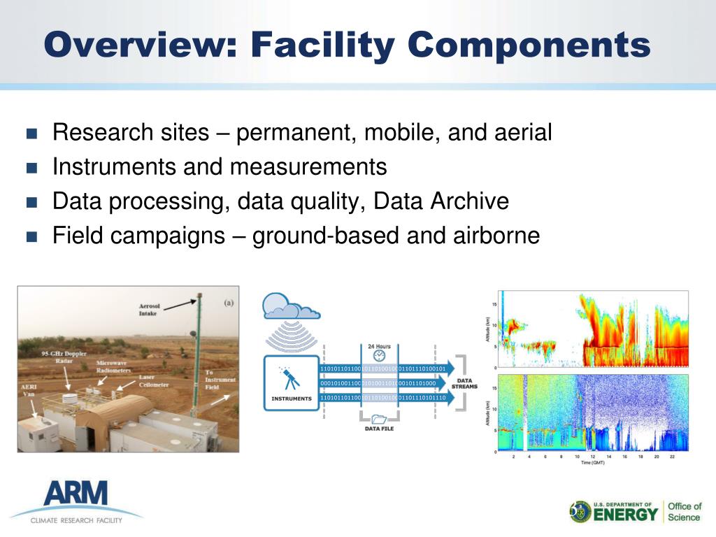 Overview: Facility Components • Research sites – permanent, mobile, and aerial • Instruments and measurements • Data processing, data quality, Data Archive • Field campaigns – ground-based and airborne