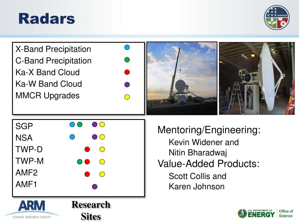 Radars X-Band Precipitation C-Band Precipitation Ka-X Band Cloud Ka-W Band Cloud MMCR Upgrades SGP NSA TWP-D TWP-M AMF2 AMF1 Mentoring/Engineering: Kevin Widener and Nitin Bharadwaj Value-Added Products: Scott Collis and Karen Johnson Research Sites