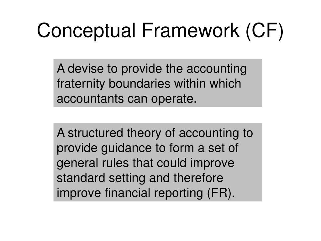 Conceptual Framework (CF) A devise to provide the accounting fraternity boundaries within which accountants can operate. A structured theory of accounting to provide guidance to form a set of general rules that could improve standard setting and therefore improve financial reporting (FR).