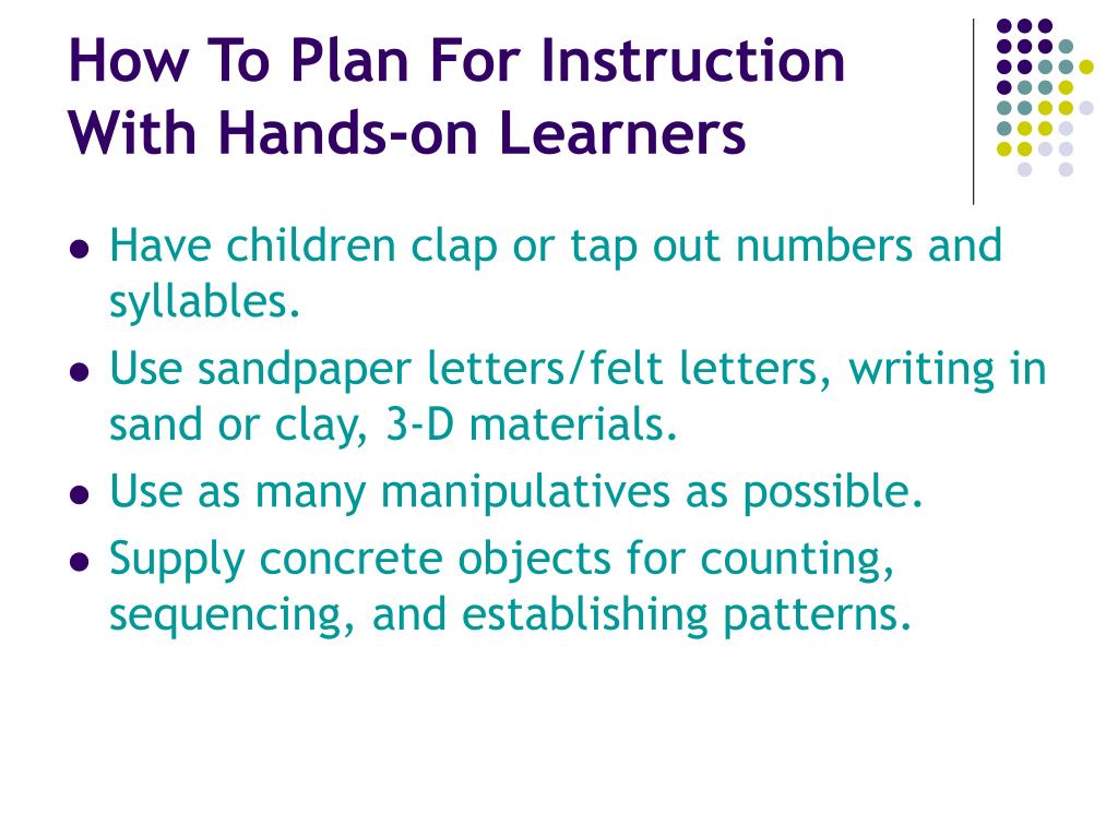 How To Plan For Instruction With Hands-on Learners • Have children clap or tap out numbers and syllables. • Use sandpaper letters/felt letters, writing in sand or clay, 3-D materials. • Use as many manipulatives as possible. • Supply concrete objects for counting, sequencing, and establishing patterns.
