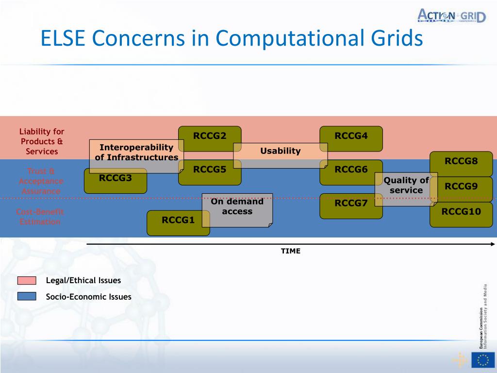 Liability for Products & Services RCCG2 RCCG4 Interoperability of Infrastructures Usability RCCG8 RCCG5 RCCG6 Trust & Acceptance Assurance RCCG3 Quality of service RCCG9 On demand access RCCG7 RCCG10 Legal/Ethical Issues Cost-Benefit Estimation RCCG1 Socio-Economic Issues TIME ELSE Concerns in Computational Grids