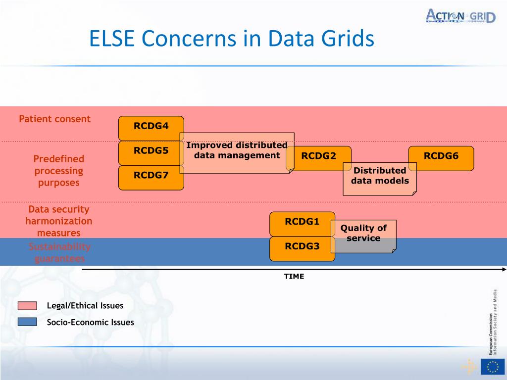 Patient consent RCDG4 Improved distributed data management RCDG5 RCDG2 RCDG6 Predefined processing purposes Distributed data models RCDG7 Data security harmonization measures RCDG1 Quality of service Legal/Ethical Issues RCDG3 Sustainability guarantees Socio-Economic Issues TIME ELSE Concerns in Data Grids